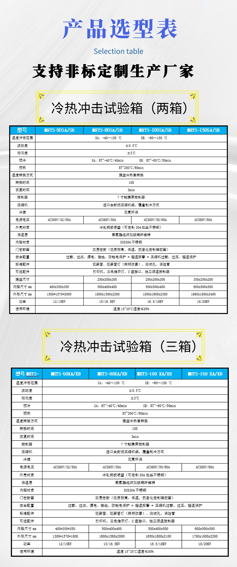 1、冷热冲击试验箱又称高低温冲击试验箱、温度冲击试验箱等,按结构区分有两箱式和三箱式。主要用于航空航天、汽车制造、船舶兵器、电子电工、仪器仪表等行业,对以上行业所用材料,配件等进行温度变化试验、、冷热冲击试验、高温低温交替冲击试验,对以上行业中使用的金属、塑料、橡胶、电子、新材料、合材料等在瞬间下经极高温及极低温的连续环境下所能耐受的程度,得以在*短时间内检测试样因热胀冷缩所引起的化学变化或物理伤害。